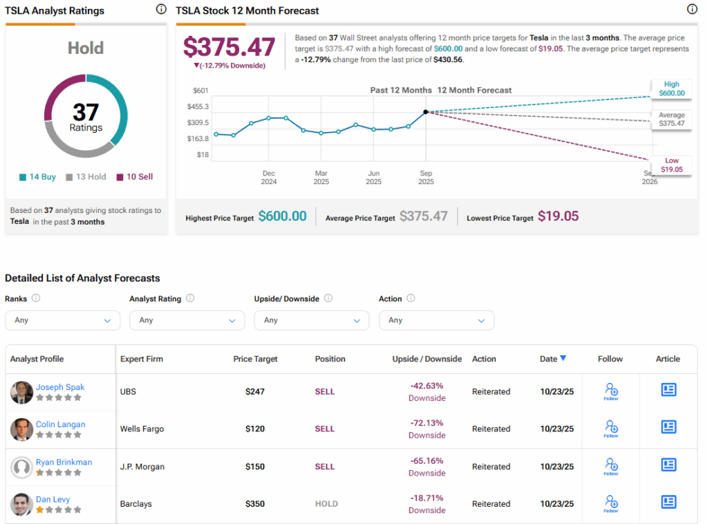 Turning to Wall Street, the analysts’ consensus rating for Tesla is Hold, based on 14 Buy, 13 Hold, and 10 Sell ratings over the past three months. With that comes an average TSLA stock price target of $375.47, representing a potential 12.79% downside for the shares. These ratings and price targets will likely change as additional analyst coverage rolls in after the company’s earnings report.
