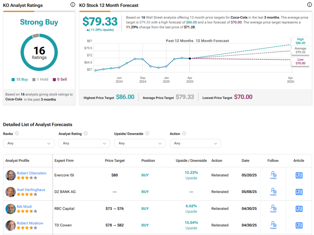 Turning to Wall Street, the analysts’ consensus rating for Coca-Cola is Strong Buy, based on 15 Buy and one Hold ratings over the past three months. With that comes an average KO stock price target of $79.33, representing a potential 11.29% upside for the shares.