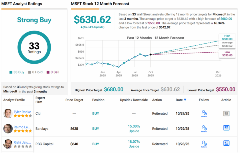Wall Street is A-OK with Microsoft as well. Its 33 Buy ratings – with nary a single Hold or Sell – give the company a Strong Buy consensus rating. MSFT’s 12-month average price target of $630.62 implies gains of ~16%. (See MSFT stock forecast)