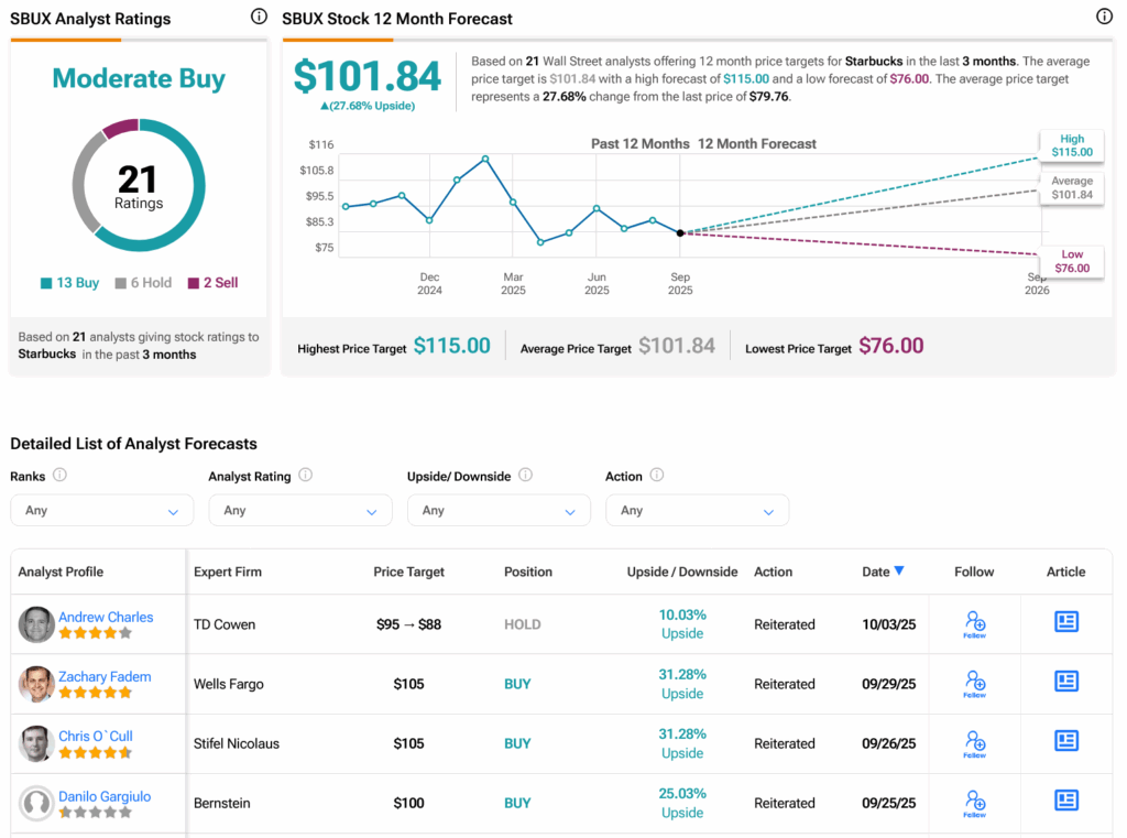 Turning to Wall Street, analysts have a Moderate Buy consensus rating on SBUX stock based on 13 Buys, six Holds and two Sells assigned in the past three months, as indicated by the graphic below. After a 14.74% loss in its share price over the past year, the average SBUX price target of $101.84 per share implies 27.68% upside potential.