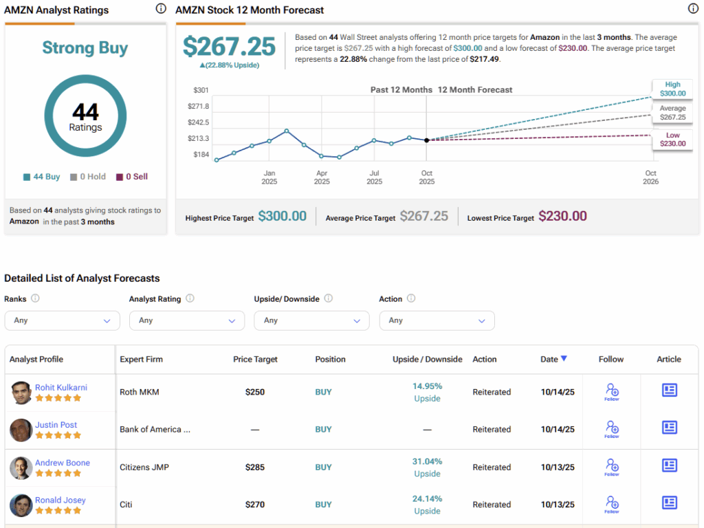 Wall Street sentiment couldn’t be more bullish. All 44 analysts covering the stock over the past three months are recommending a Buy on AMZN. Their average price target sits at $267.25, implying an upside potential of almost 23% over the next 12 months.