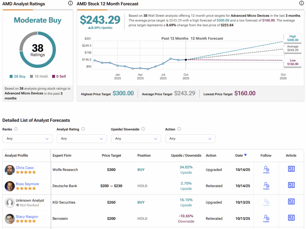 Wall Street consensus on AMD stock is generally bullish, though there’s still room for some skepticism. Of the 38 analysts covering the stock, 28 are bullish, while the remaining 10 are neutral with no bears in sight. AMD’s average price target stands at $243.29, implying roughly 8% upside from the current share price over the coming 12 months.