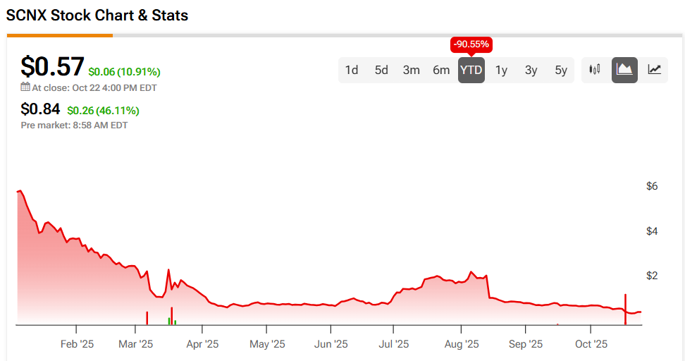 Scienture stock was up 46.11% in pre-market trading on Thursday, extending a 10.91% rally yesterday. Even so, SCNX shares have fallen 90.55% year-to-date and 92.22% over the past 12 months.