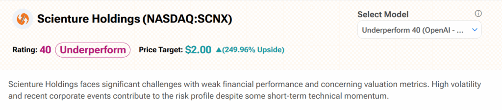 Turning to Wall Street, analyst coverage of Scienture is limited. Fortunately, TipRanks’ AI analyst Spark has it covered. Spark rates SCNX stock an Underperform (40) with a $2 price target. It cites “weak financial performance and concerning valuation metrics” as reasons for this stance.