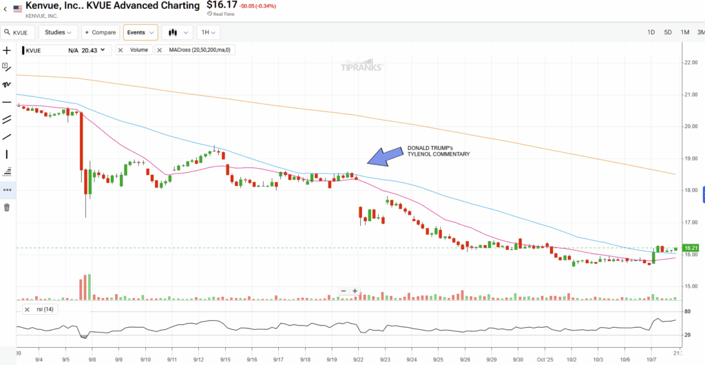 Shares of consumer health company Kenvue (KVUE) have plunged following the Trump administration’s announcement that Tylenol use during pregnancy may be associated with a higher risk of autism. Although the announcement was made on September 22, the stock has continued to slide. The allegations had been circulating for months, but their renewed attention has contributed to a 25% decline in Kenvue’s share price over the past six months.