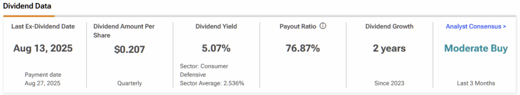 Kenvue stands out as an attractive dividend stock, offering a yield of 5.07%—roughly four times higher than the S&P 500’s current yield of 1.3% and double the sector average of 2.5%.