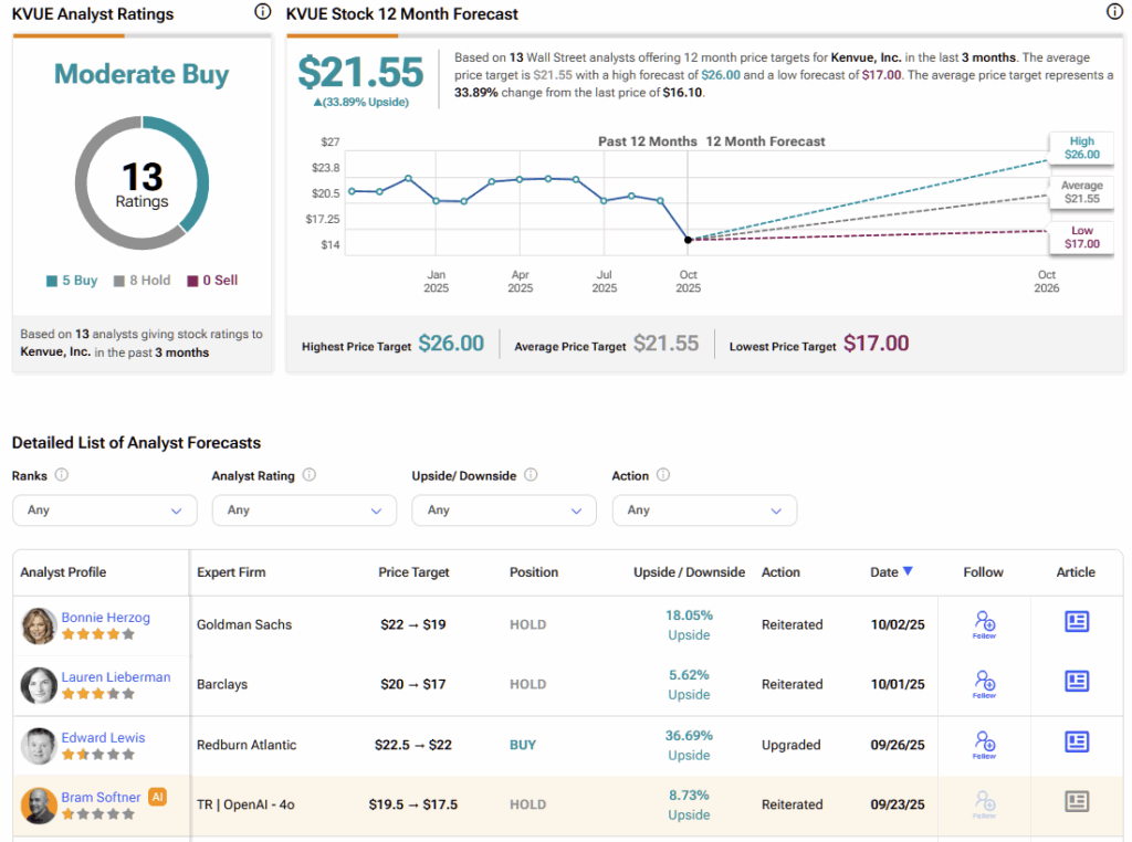 Turning to Wall Street, KVUE earns a Moderate Buy consensus rating based on five Buys, eight Holds, and zero Sell ratings assigned in the past three months. The average KVUE stock price target of $21.55 implies almost 34% upside potential.