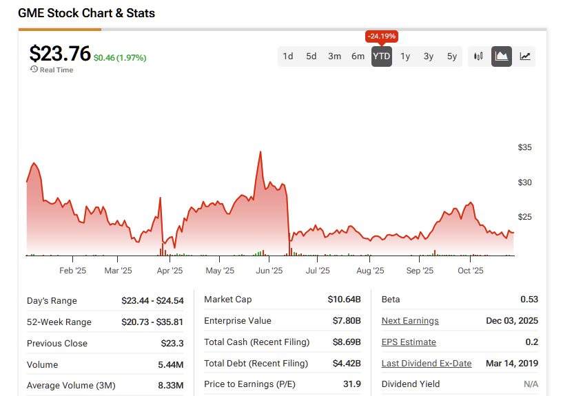 Shares of the video game retailer had a brief glimmer of hope when GameStop (GME) reported its fiscal Q2 results in September, with the stock jumping as much as 17% by early October. However, throughout the month, that momentum quickly faded, and today GameStop trades roughly at the same levels as before the July-quarter release—marking a sharp ~24% year-to-date decline.