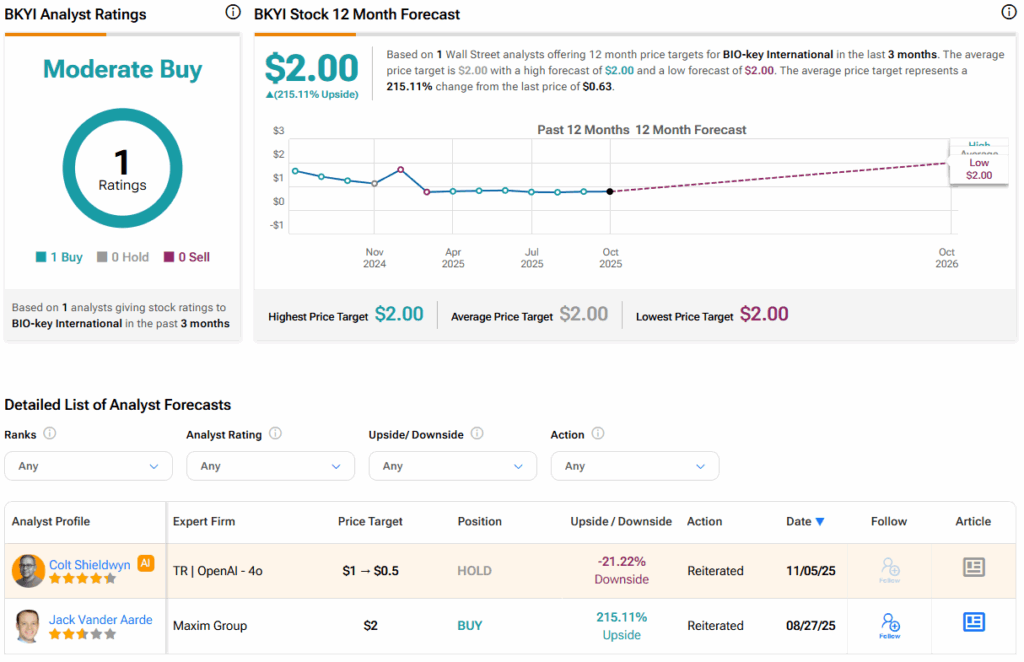 Turning to Wall Street, the analysts’ consensus rating for BIO-key International is Moderate Buy, based on a single Buy rating over the past three months. With that comes an average BKYI stock price target of $2, representing a potential 215.11% upside for the shares.