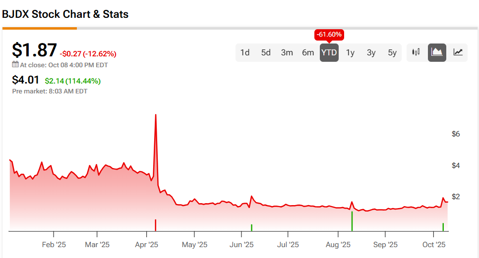 Bluejay Diagnostics stock was up 114.44% in pre-market trading on Thursday, following a 12.62% drop yesterday. The shares have fallen 61.6% year-to-date and 68.28% over the past 12 months. With today’s news came heavy trading, as some 40 million shares changed hands, compared to a three-month daily average of about 154,000 units.