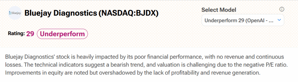 Turning to Wall Street, analyst coverage of Bluejay Diagnostics is lacking. Fortunately, TipRanks’ AI analyst Spark has it covered. Spark rates BJDX stock an Underperform (29) with no price target. It cites “poor financial performance, with no revenue and continuous losses” as reasons for this stance.