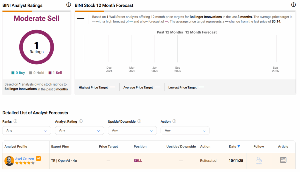 Turning to Wall Street, the analysts’ consensus rating for Bollinger Innovations is Moderate Sell, based on a single Sell rating over the past three months. Investors will note there currently isn’t an average price target for BINI stock.