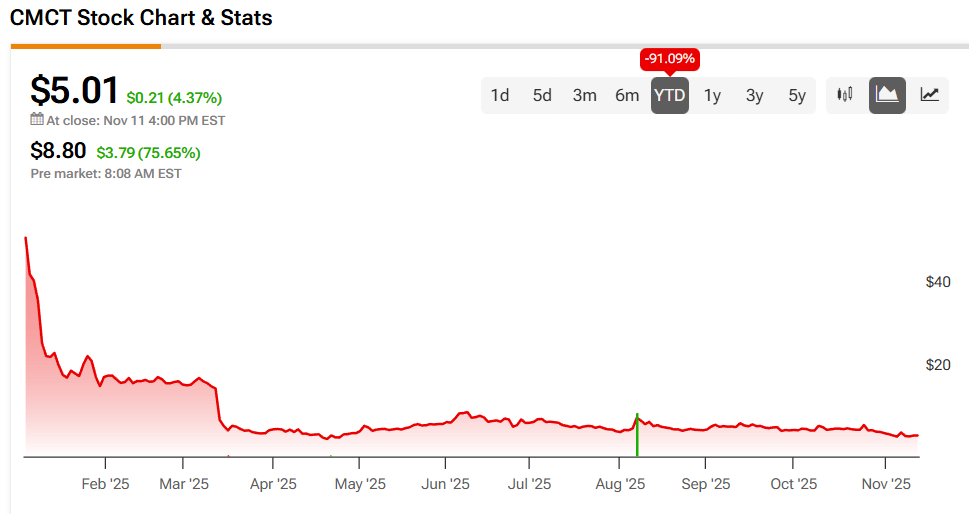 Creative Media stock was up 75.65% in pre-market trading on Wednesday, following a 4.37% jump yesterday. Even so, the stock has fallen 91.09% year-to-date and 93% over the past 12 months.