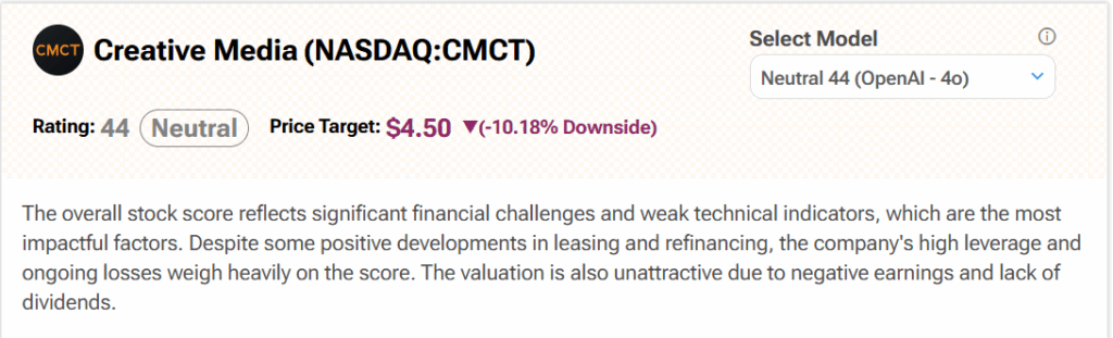 Turning to Wall Street, analyst coverage of Creative Media is lacking. Fortunately, TipRanks’ AI analyst Spark has it covered. Spark rates CMCT stock a Neutral (44) with a $4.50 price target. It cites “significant financial challenges and weak technical indicators” as reasons for this stance.