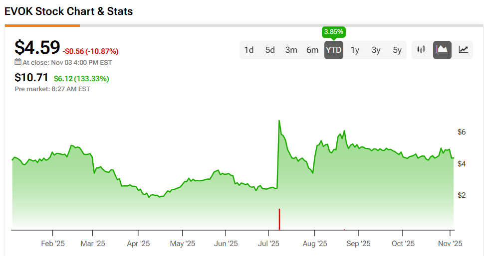 Evoke Pharma (EVOK) stock rocketed higher on Tuesday after the specialty pharmaceutical company announced an acquisition deal with privately held pharmaceutical company QOL Medical. This agreement will have QOL Medical acquire Evoke Pharma for $11 per share, representing a 139.7% premium to the stock’s closing price on Monday. The company will use cash on hand to fund the deal, which it expects to close in Q4 2025.