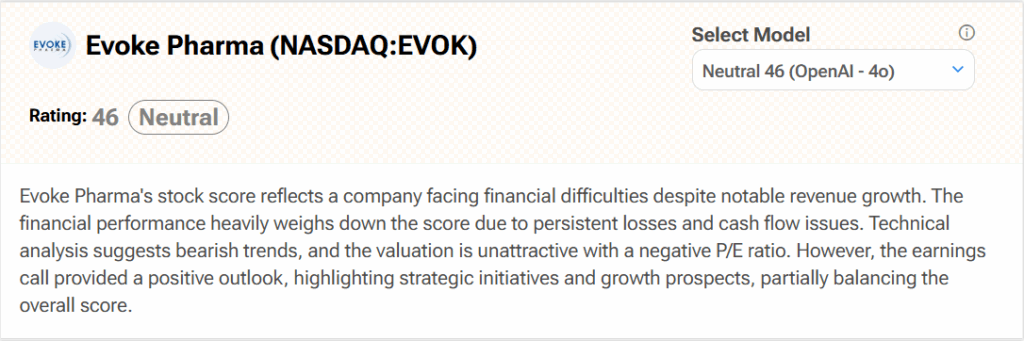 Turning to Wall Street, coverage of Evoke Pharma is lacking. Fortunately, TipRanks’ AI analyst Spark has it covered. Spark rates EVOK stock a Neutral (46) with no price target. It cites “financial difficulties despite notable revenue growth” as reasons for this stance.