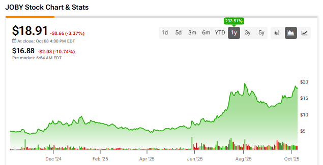 The stock is down more than 10% in today’s pre-market trading, following a 4% decline on Tuesday. However, Joby shares have jumped more than 230% over the past year, supported by optimism about the electric air taxi market and the company’s progress toward FAA certification.