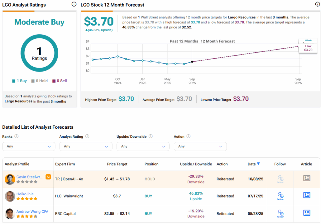 Turning to Wall Street, the analysts’ consensus rating for Largo Resources is Moderate Buy, based on a single Buy rating over the past three months. With that comes an LGO stock price target of $3.70, representing a potential 46.83% upside for the shares.