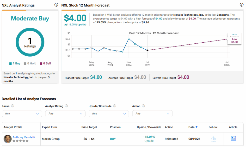 Turning to Wall Street, the analysts’ consensus rating for Nexalin Technology is Moderate Buy, based on a single Buy rating over the past three months. With that comes a $4 price target for NXL stock, representing a potential 115.05% upside for the shares.