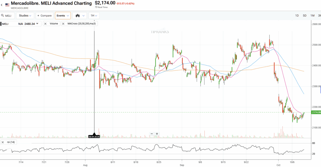 MercadoLibre (MELI) shares have tumbled roughly 15% since the company reported Q2 earnings on August 4, when investors were rattled by margin compression driven by rising shipping costs amid intensifying competition. After trading in a steady range between $2,300 and $2,500 throughout September, the stock has taken a proverbial cliff dive in October and now sits at $2,174 per share.