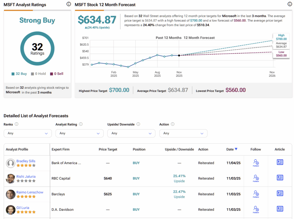 Microsoft is one of those rare stocks that’s nearly impossible to dislike. Over the past three months, all 32 analysts covering $MSFT have rated it a Buy—a unanimous show of confidence. The average stock price target of $634.87 suggests roughly 24% upside from current levels.