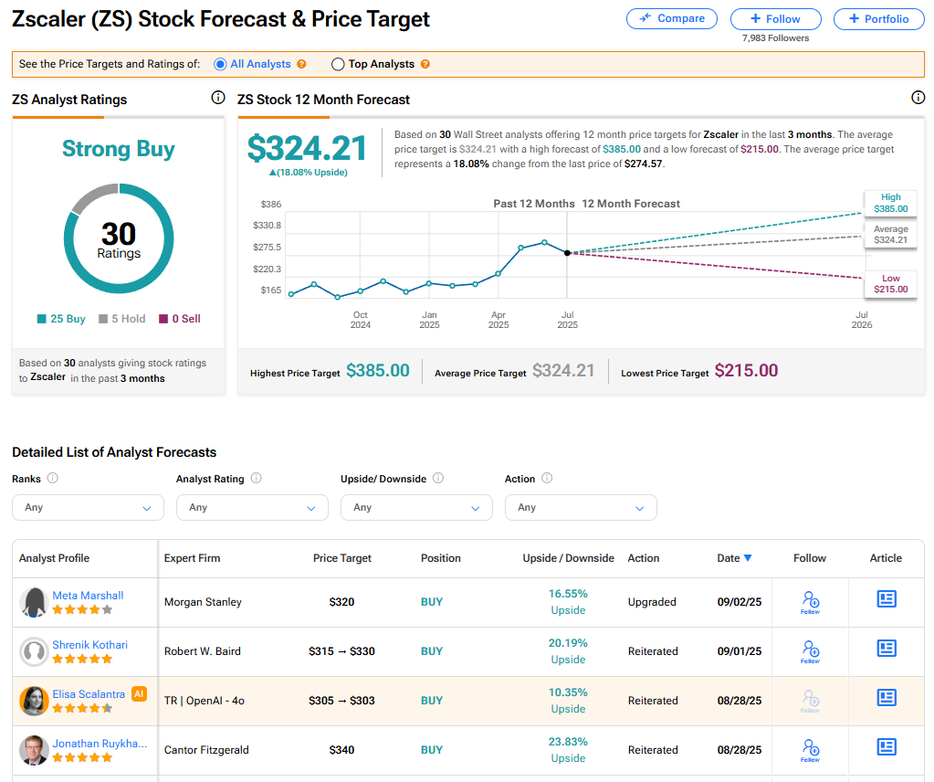 The stock of Zscaler has a consensus Strong Buy rating among 30 Wall Street analysts. That rating is based on 25 Buy and five Hold recommendations issued in the last three months. The average ZS price target of $324.21 implies 18.08% upside from current levels. These ratings are likely to change after the company’s financial results.
